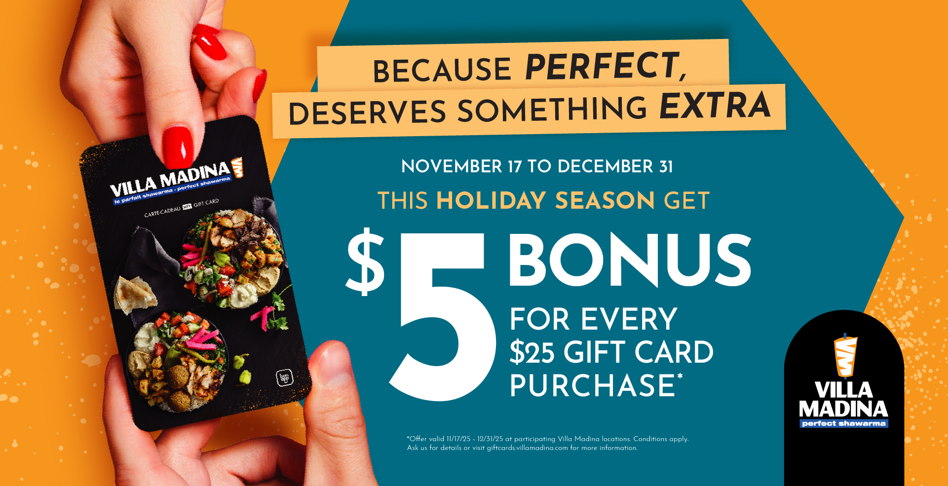 Available in-store for gift card purchases with a minimum $25 purchase per transaction from November 17-December 31, 2025. Qualifying gift card purchases include a $5 bonus on $25 gift card purchase, $10 bonus on $50 gift card purchase, and $20 bonus on $100 gift card purchase. The bonus top-up will be on the same Gift Card. Please allow up to ten (10) to fifteen (15) minutes for the bonus to be applied to the Gift Card. Bonus amount will not appear on the original purchase receipt. Bonus/Topped Up Gift Card value(s) are issued per qualifying purchase up to a maximum of $20 in bonus value. Gift Cards are redeemable only at participating Villa Madina locations. Gift card values, including the bonus, cannot be exchanged or redeemed for cash and are non-transferable. Lost, stolen, or damaged Gift Cards will not be replaced. Offer not valid with any other promotions or discounts. Villa Madina reserves the right to modify or cancel this offer at any time without prior notice.