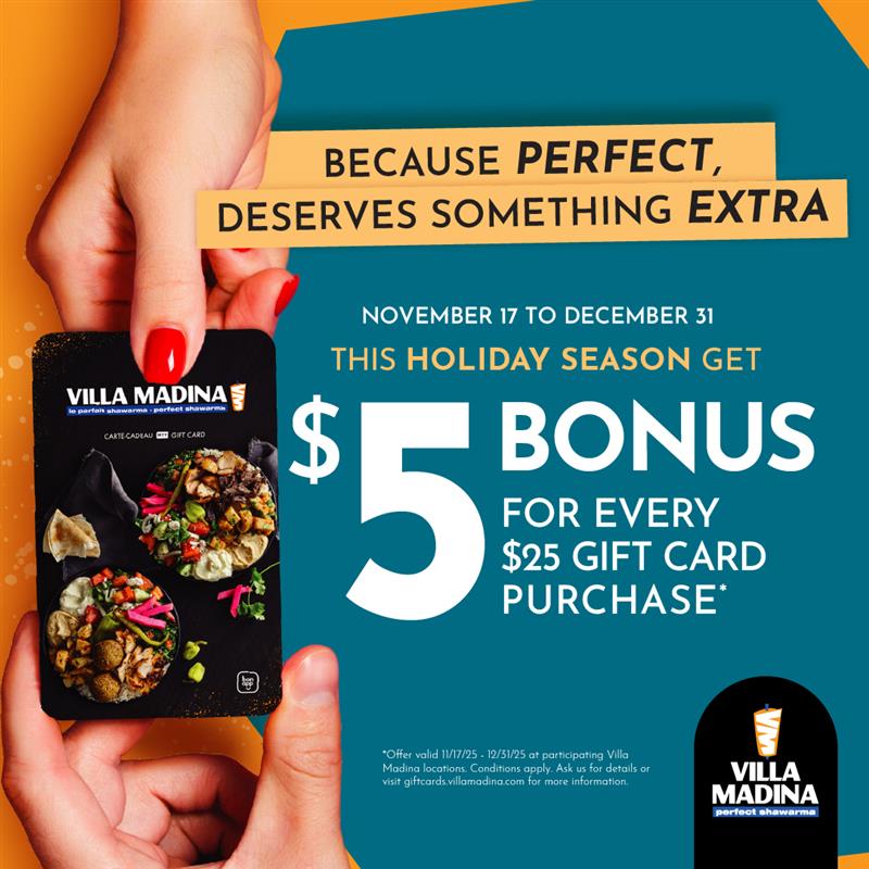 Available online for gift card purchases with a minimum $25 purchase per transaction from November 17-December 31, 2025. Qualifying gift card purchases include a $5 bonus on $25 gift card purchase, $10 bonus on $50 gift card purchase, and $20 bonus on $100 gift card purchase. The bonus top-up will be on the same Gift Card. Please allow up to ten (10) to fifteen (15) minutes for the bonus to be applied to the Gift Card. Bonus amount will not appear on the original purchase receipt. Bonus/topped up Gift Card value(s) are issued per qualifying purchase up to a maximum of $20 in bonus value. Gift Cards are redeemable only at participating Villa Madina locations. Gift card values, including the bonus, cannot be exchanged or redeemed for cash and are non-transferable. Lost, stolen, or damaged Gift Cards will not be replaced. Offer not valid with any other promotions or discounts. Villa Madina reserves the right to modify or cancel this offer at any time without prior notice.